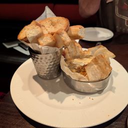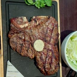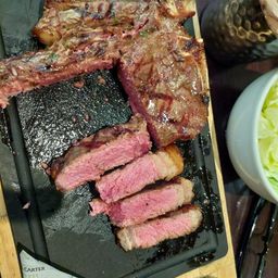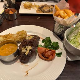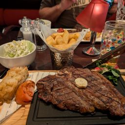 The main meals were soon served, beginning with two 9 oz rump steaks, both cooked medium rare. Next came two very impressive 20 oz T-Bone steaks, also cooked medium rare. A comment was made about the cold onion bread which didn’t seem to belong. Another selection was the 10 oz 50-day aged filet mignot, one cooked well done the other medium rare with Café Paris sauce and a blue cheese lettuce wedge. The last meal was a 12 oz Ribeye (cooked perfectly) there was a long wait for his triple cooked chips which eventually arrived and were noticeably very salty.