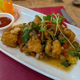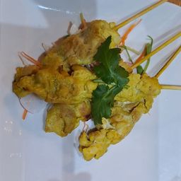 The starters arrived and they were Poh Pia Ped (Duck spring rolls which were lush and warm), next came Tod Man Pla (Thai fish cakes), Pla Mueg Tod (Batter fried Calamari, very tasty) and lastly Gai Satay (Grilled chicken skewers with a peanut sauce).