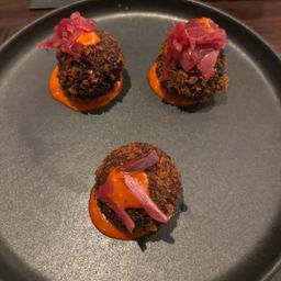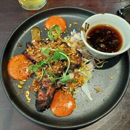 The starters arrived and they didn’t disappoint. Two went for the Beef shin croquettes (fantastic), two shared the baked Camembert, drizzled with hot honey and topped with dukkah seeds and handmade onion marmalade (amazing) The final three chose the Soy Mirin belly pork with miso dressing and crying tiger sauce.