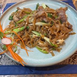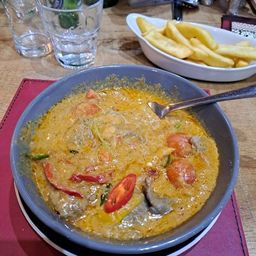 The consensus from the table was that more Prawn Crackers would have been very acceptable. While we discussed this let down another round of drinks was ordered. The restaurant was quiet which we didn’t mind as the Chef was able to concentrate on our order. The main meals were served staggered which was ok as long as you were one of the first and not waiting till the end. Two had chosen the Pad See Aew (Stir fried rice noodles with egg, garlic, green vegetables and either chicken or duck), three decided on the Lamb Shank (couldn’t find the Thai for Lamb Shank so asked Google – Massaman Gae? This got mixed reviews, two gave it thumbs up, one definitely gave it a thumb down. Other choices were; Beef Panang (it was very tasty but the beef was a bit over chewy which spoilt it), Tod Kateam Priktai (stir fried chicken with garlic and pepper sauce) and lastly Thai Green Curry (spicy coconut sauce laced with aromatic green Chilli paste – delicious)