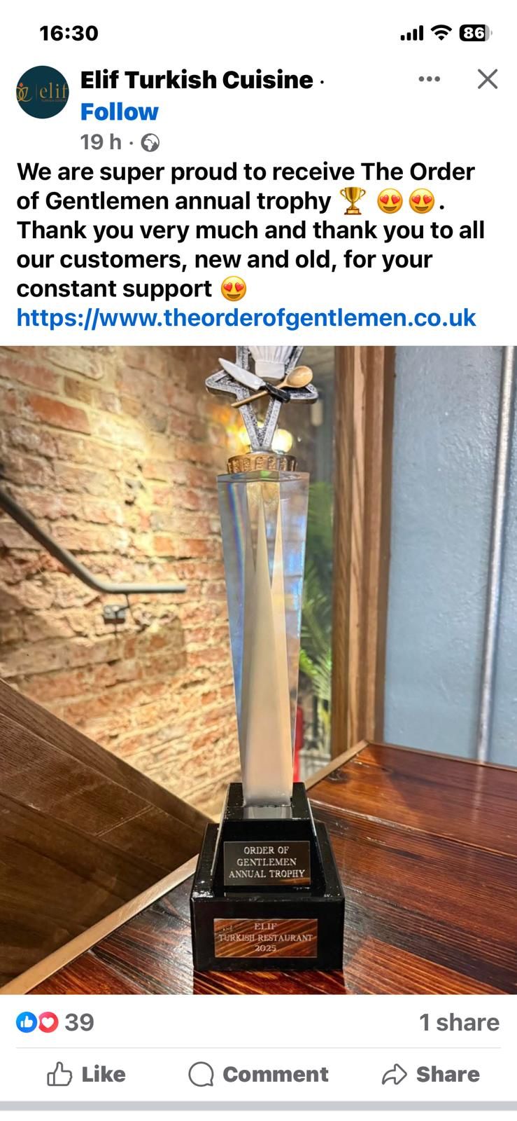 If you are looking for quality, well-cooked and presented food, at a very reasonable price, this is the place to go. We thank the staff for making the evening even better than last time. It’s probably too early to say but the Elif Turkish Restaurant will be in the running for the coveted Order of Gentlemen Trophy.